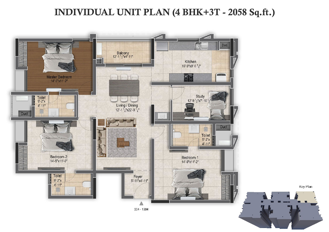 | Apartment Types & Sizes : | 3BHK + 3T - 1837 Sq.ft. - 1918 Sq.ft. 4BHK + 3T - 2058 Sq.ft. & 2143 Sq.ft. |